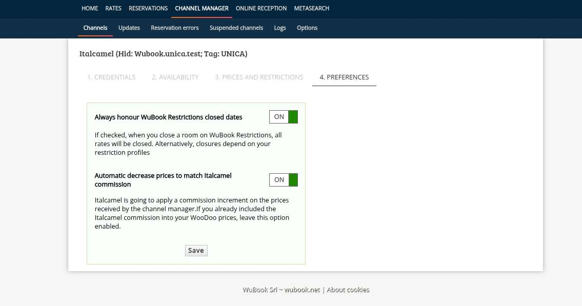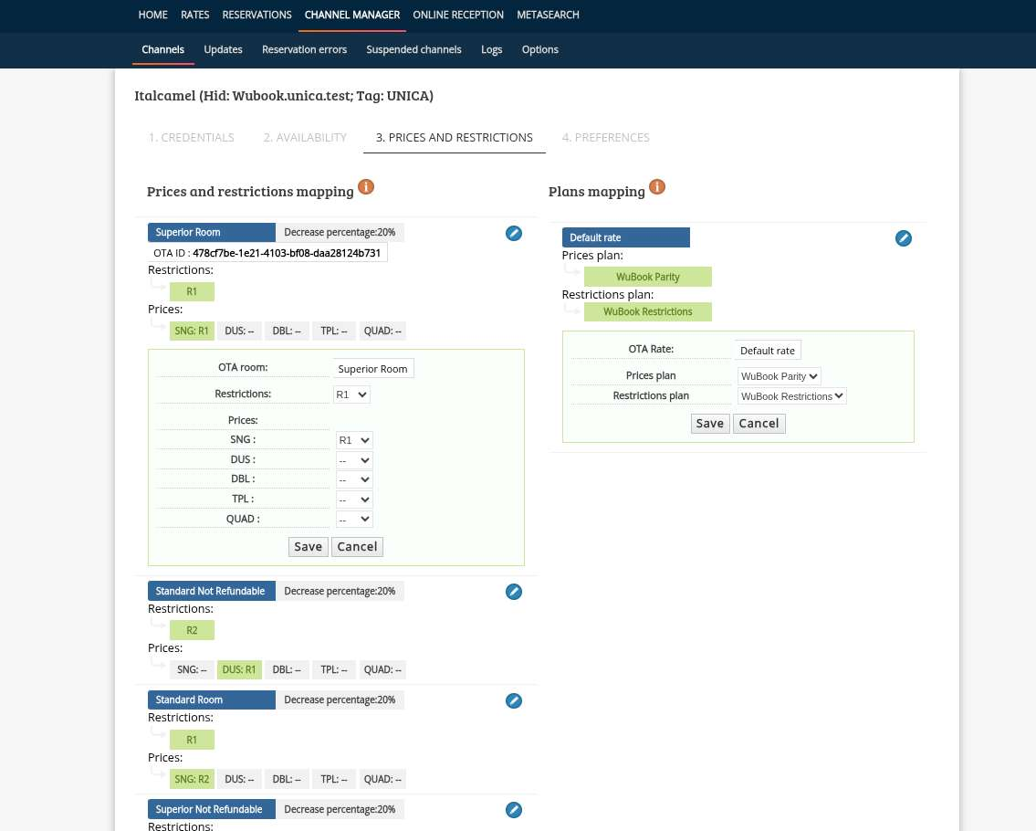 This section defines how the Channel Manager's rates and restrictions are applied to the Italcamel channel.