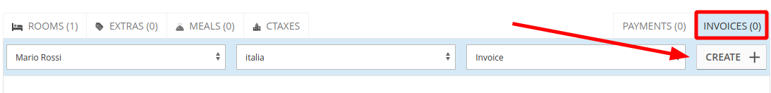 Click on the “INVOICES” tab, choose which guest to invoice, which tax position to use (if you have multiple headers), and what type of document you want to issue. Then click on “CREATE” to continue: