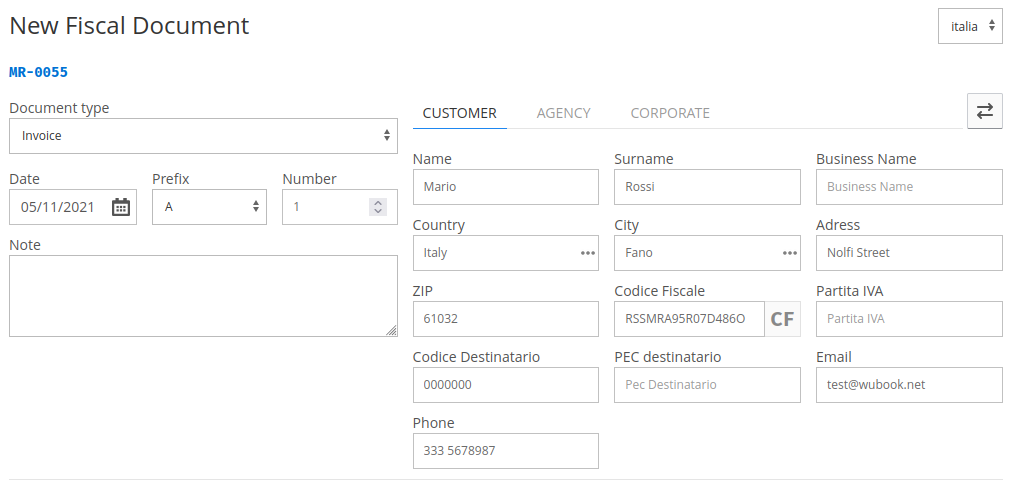 You can now proceed to issue a document as usual. You can choose the header to use, the document type, and the recipient (who can be a customer, an agency, or a company):