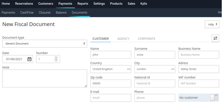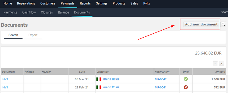 You can also issue an invoice that is not linked to a reservation. For example, to sell a product or service independently of a reservation. In this case, you must proceed from the following section. Click on “Add a new document” at the top right: