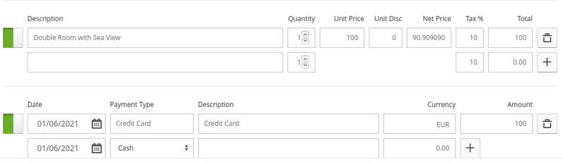 At the bottom of the page, you will find the button to add the Services to be billed and Payments. For each service, you can specify the quantity, unit price, tax, and discount. The total and net price are calculated by the system, but it is always possible to modify the total.