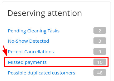 In the alerts box on the Home page, under Deserving attention, you will be notified if there are reservations with outstanding payments that have already checked out within the last 7 days.