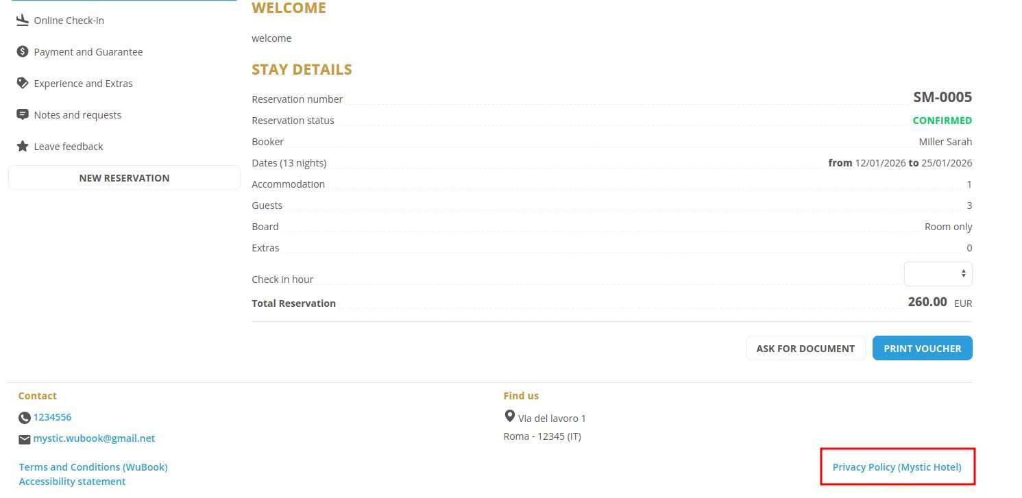 At this point, when you send the guest the link to Online Check-in or when he accesses the Guest Page to view his reservation details, he will find the link to your privacy policy in the "Summary" section: