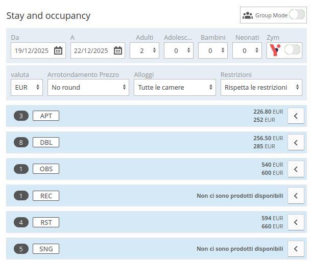 La sección Productos Disponibles te permite definir las fechas de la estancia y elegir la(s) habitación(es). Cuando indicas el periodo de estancia, ZaK comprueba qué productos están disponibles en ese periodo. Si has creado varios subproductos para las habitaciones en función de la ocupación, también puedes especificar la ocupación (número de adultos, adolescentes, niños y bebés) para refinar aún más la búsqueda. Verás teclas rápidas para ocupaciones de 1 y 2, para los números 3 en adelante puedes abrir el menú desplegable.