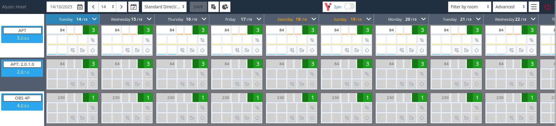 el botón "Zym ": si está habilitado, verás los precios modificados por el Yield Manager. Así como también sobreescribirlos o resetearlos.
