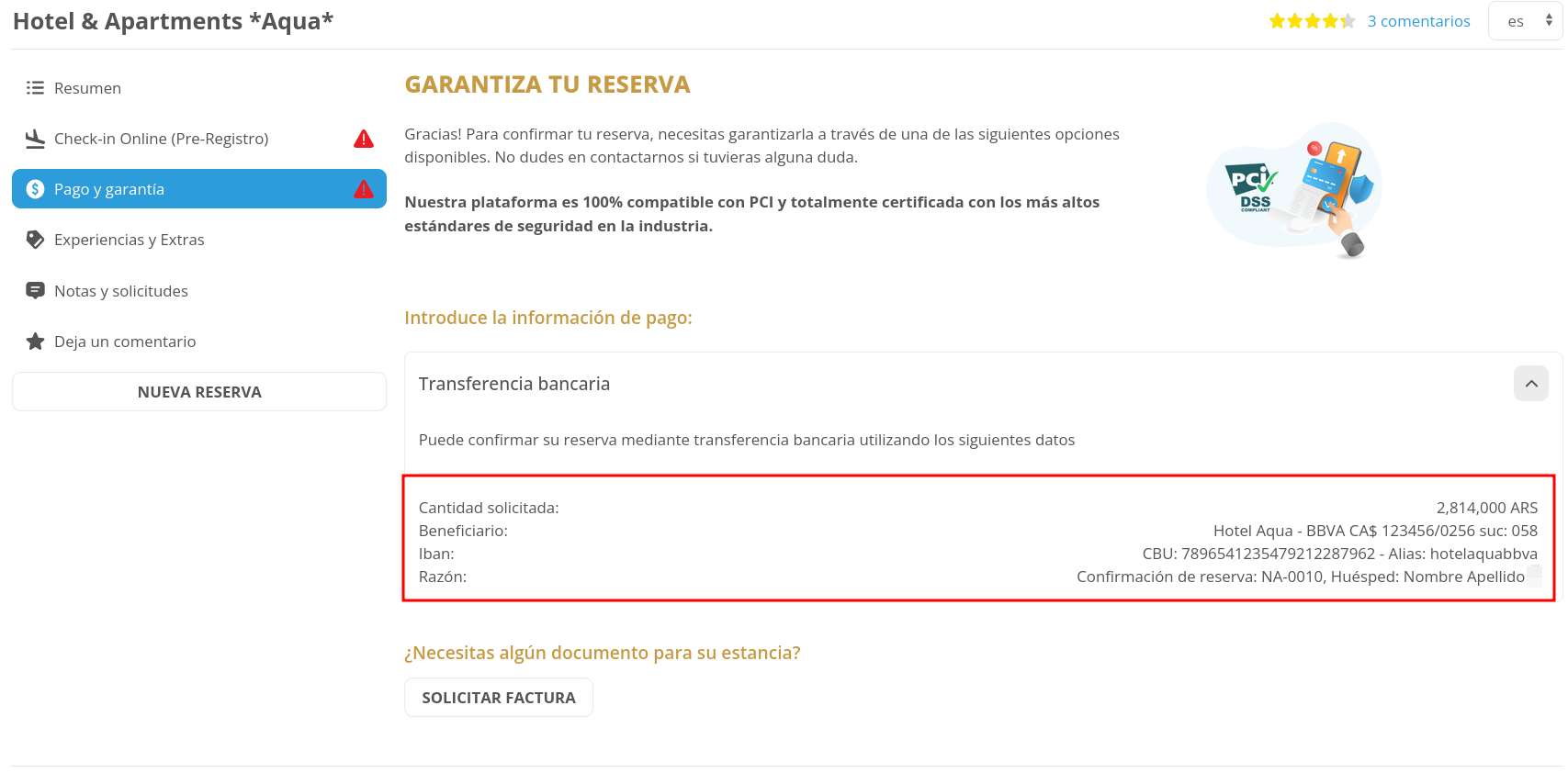 - Pago: este método, si está habilitado, siempre estará presente y siempre se mostrará junto con los demás. Es decir, que el huésped siempre tendrá la posibilidad de realizar un pago inmediato, si este método está habilitado.