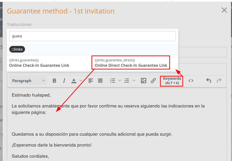 Las plantillas para estos emails deben ser previamente creadas en la sección Plantillas, eligiendo el Tipo "Nivel Reserva". Recuerda colocar una de las keywords relacionadas con el método de garantía, para que el huésped pueda cliquear en su enlace y ser redirigido a su Página de huésped automáticamente:
