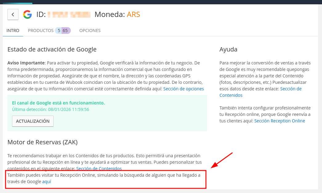 - Dentro del canal, en la sección INTRO, encontrarás un enlace para ver cómo se muestra tu Motor de Reservas a quienes reservan a través de Google: