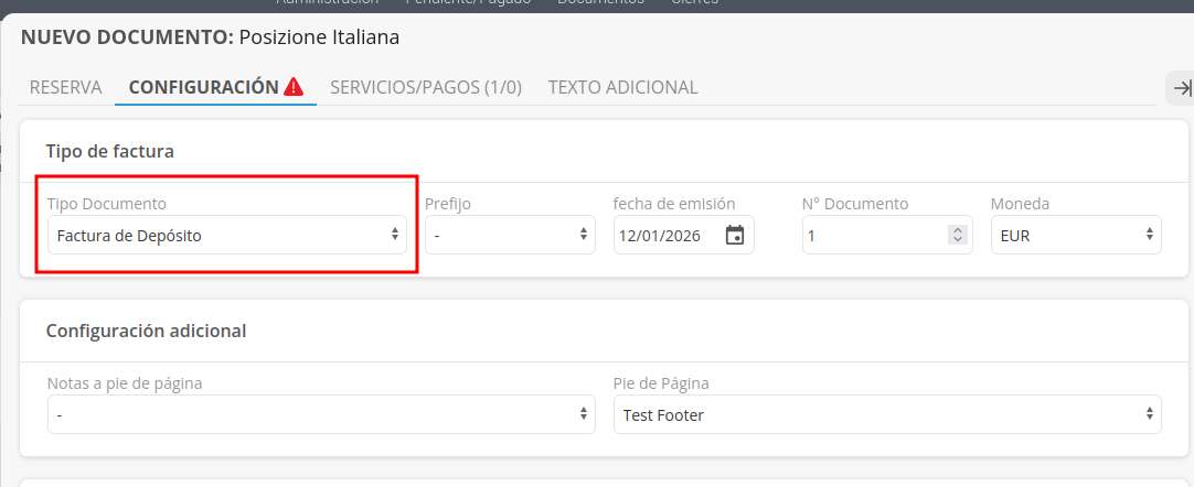 En este punto, puedes hacer clic en "Facturas" y crear una factura por el depósito de 100 EUR. Recuerda especificar el tipo de documento adecuado (Factura de Depósito):