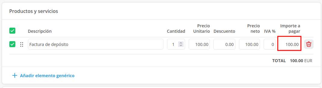 En la sección "Descripción" del documento que estás emitiendo, recuerda especificar en el campo del "Total" el monto depositado (100 EUR) y confirma dando clic en Enter.
