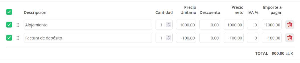 En el ejemplo siguiente, el monto total de la reserva es 1000 EUR y el huésped ya ha realizado un depósito de 100 EUR: