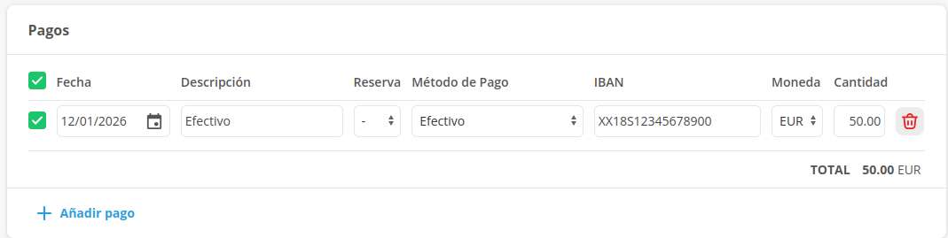 Dentro de la misma reserva podrás ingresar más de un pago, de distinto tipo, monto y hasta moneda.