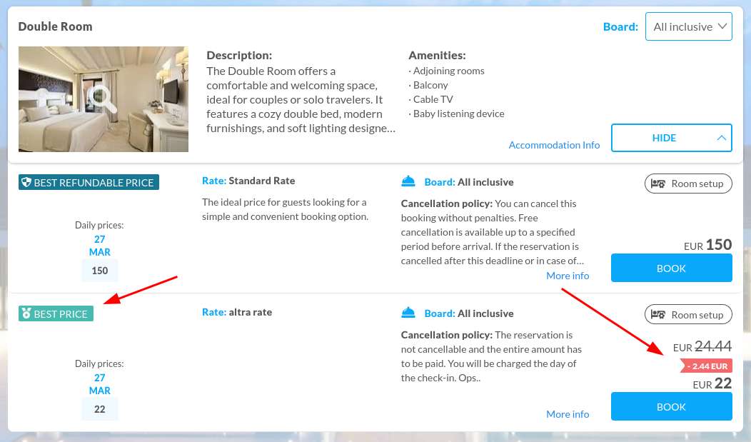 NOTA: Si para un tipo de habitación tienes múltiples soluciones que coinciden con la búsqueda realizada por el huésped, automáticamente se ocultarán los productos y tarifas más caros. Solo se mostrarán los resultados más económicos.