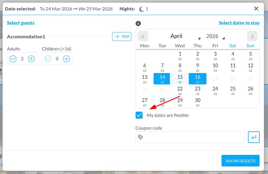 If there is no availability, enabling Flexible Dates will show the guest additional suggestions: