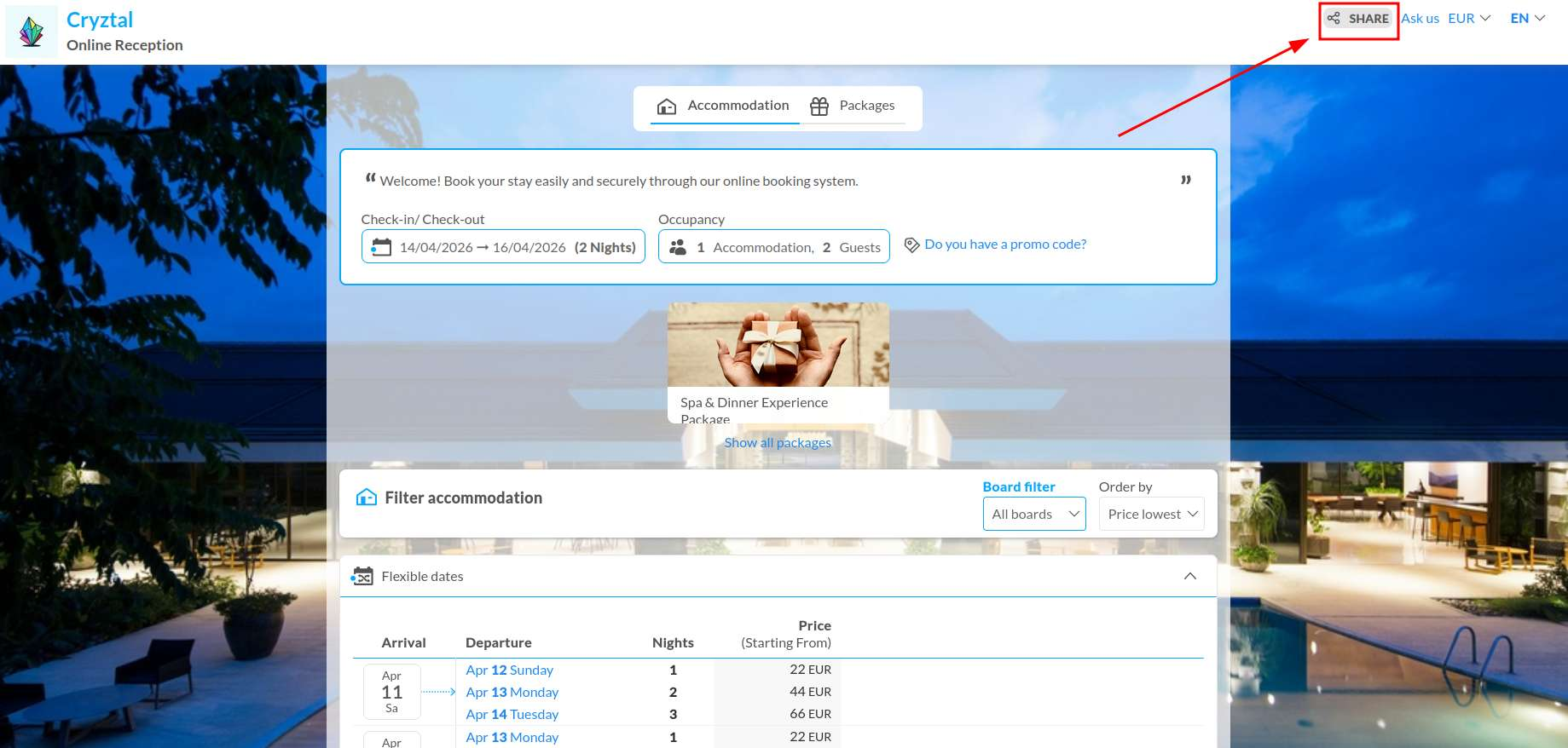 To make a reservation, the guest will access your Online Reception, which you must have already set up by following all the steps in the relevant documentation: