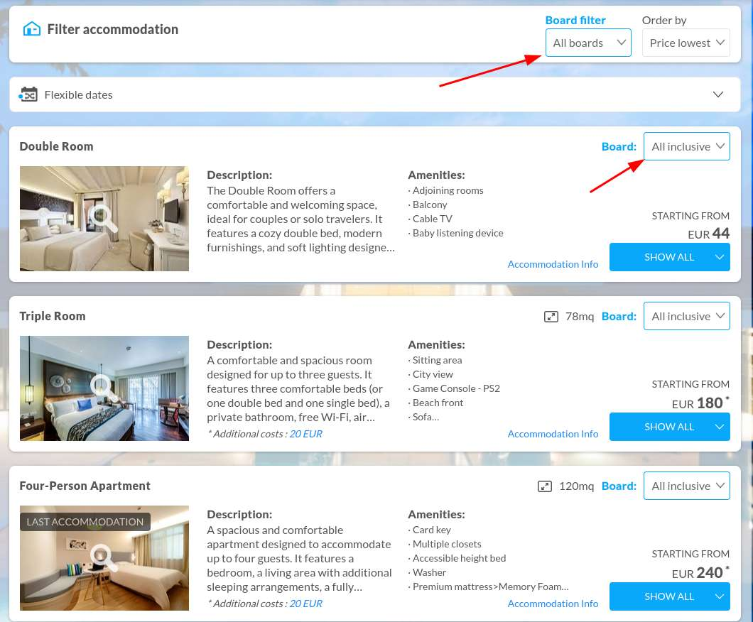 First, the guest will see all the packages available (if you've created any), and then they can choose to book a package. Alternatively, they can enter the dates and occupancy to search for all available accommodations.