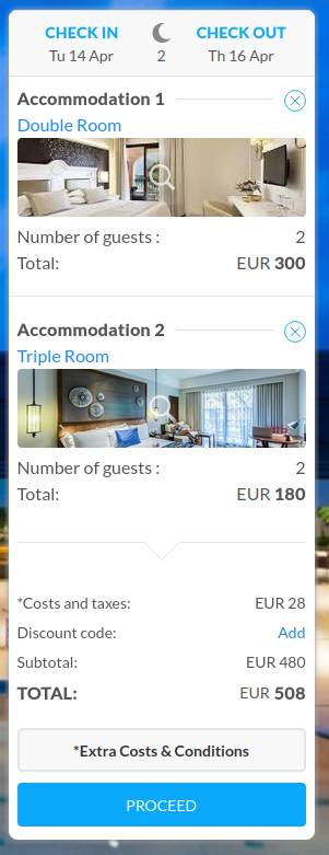 and can continue. As soon as at least one room is selected, the cart appears on the right, providing a summary of the selected accommodations:
