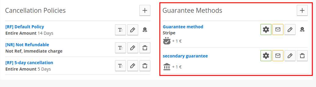 Une Méthode de Garantie définit l'utilisation des données de carte de crédit fournies par les clients pour garantir vos réservations. Zak vous fournit 5 méthodes de garantie de réservation de base, que vous pouvez utiliser pour configurer vos règles de garantie. Vous pouvez en activer plusieurs en même temps dans la même politique :