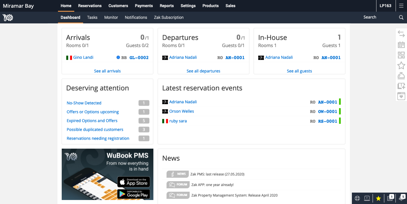 La Dashboard è la pagina iniziale che appare ogni volta che accedi al PMS ZaK. È stata creata come pagina di riepilogo dove puoi visualizzare una serie di informazioni e avvisi relativi alla tua attività. Le sezioni che la compongono sono: