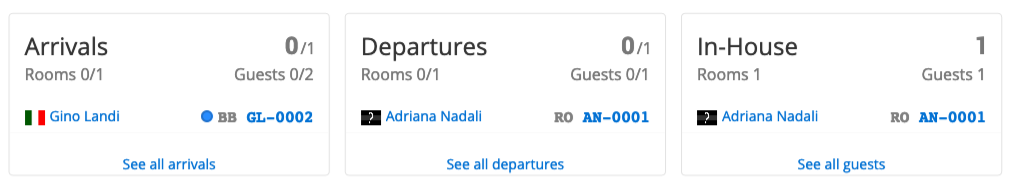Queste sottosezioni forniscono informazioni immediate sulle prenotazioni del giorno corrente. È possibile visualizzare le prenotazioni per gli arrivi (check-in) e le partenze (check-out) di oggi e quelle presenti nella struttura.