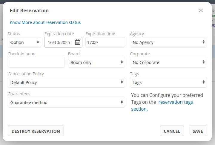 Queste prenotazioni non sono completamente garantite. Una prenotazione in opzione ha una data di scadenza che puoi inserire manualmente. In alternativa il sistema assegnerà una data di scadenza di default (la data di arrivo prevista). Il tuo ospite, attraverso il link per il check-in online, può garantire la prenotazione in base ai metodi di garanzia da te configurati (in questo caso lo stato cambierà da Opzione a Confermata).