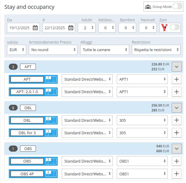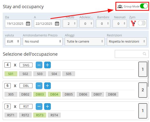 Oltre rispettare o ignorare le restrizioni, puoi anche scegliere l'opzione Prenotazione di gruppo, grazie alla quale puoi visualizzare la quantità di camere disponibili per ogni tipologia. Di conseguenza, potrai selezionare rapidamente più tipologie di camere e più camere fisiche cliccando sul "+". Se hai commesso un errore, puoi sempre rimuoverle cliccando sul "-" . Nell'esempio che segue, ho scelto 3 Matrimoniali e 1 Singola: