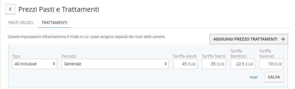 Se per i vari pasti hai dei prezzi predefiniti, puoi già impostarli nella sezione sottostante. In questo modo quando li aggiungerai alle prenotazioni, ZaK ti proporrà già il prezzo da te configurato: