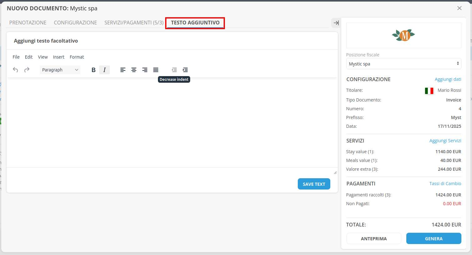 Nel caso di una fattura NON legata a una prenotazione, si può