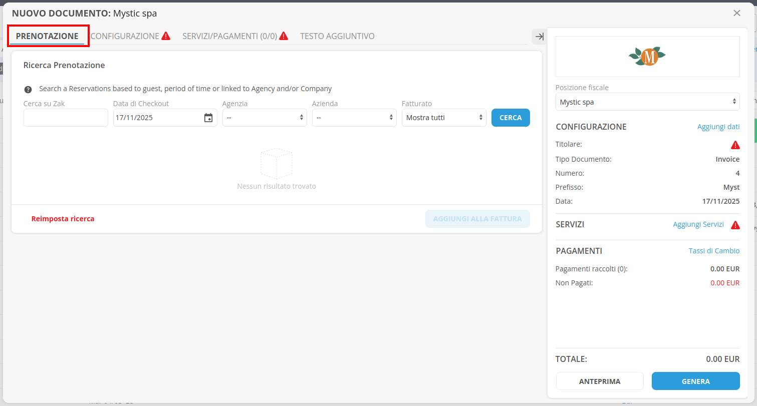 Il modulo di emissione documenti si apre automaticamenre sulla scheda PRENOTAZIONE per ricercare e selezionare una o più prenotazioni da contabilizzare nel documento: