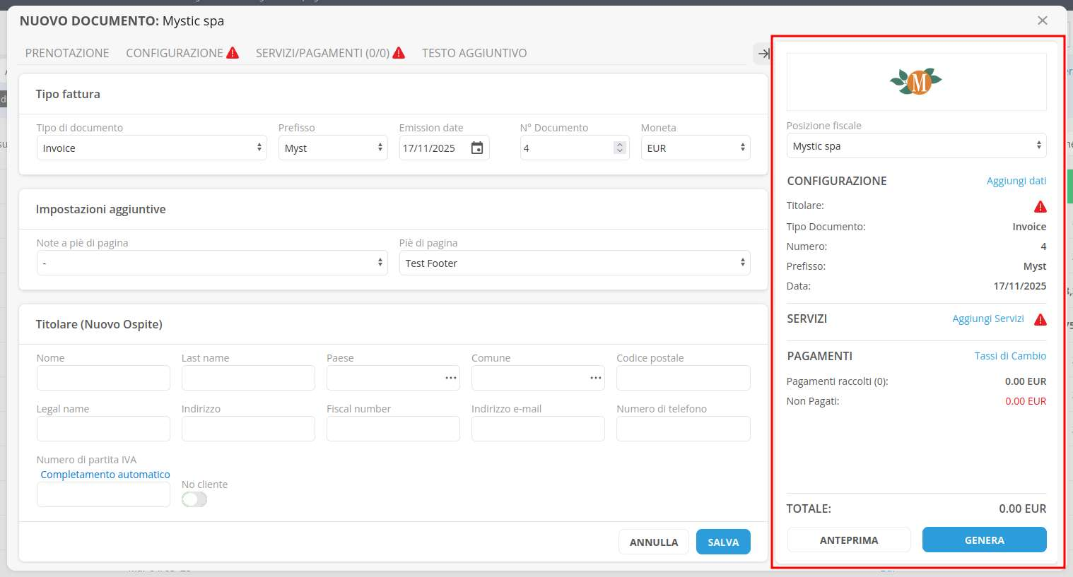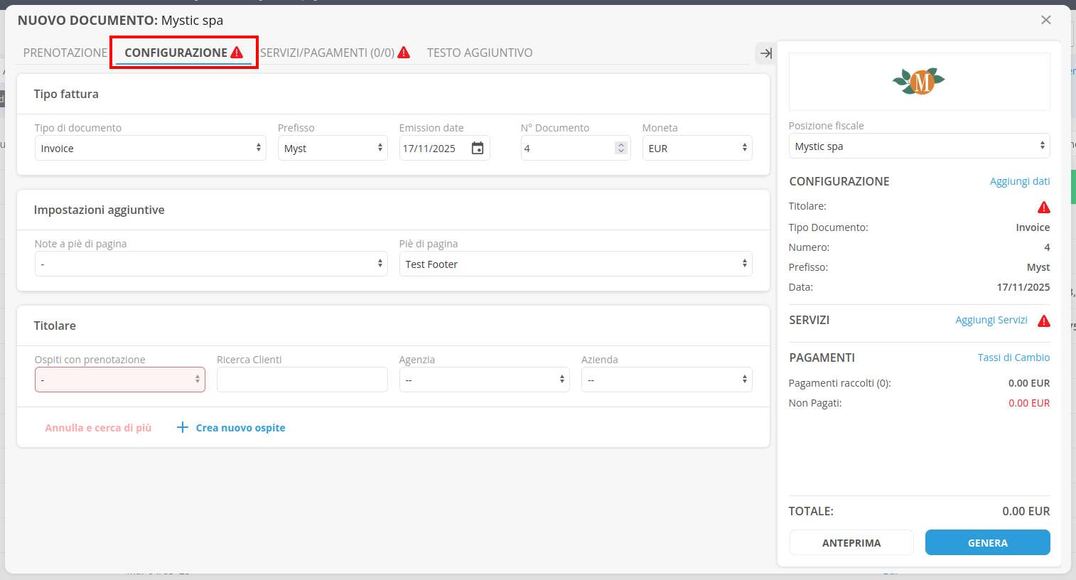 scegli a quale ospite fatturare, quale posizione fiscale usare (nel