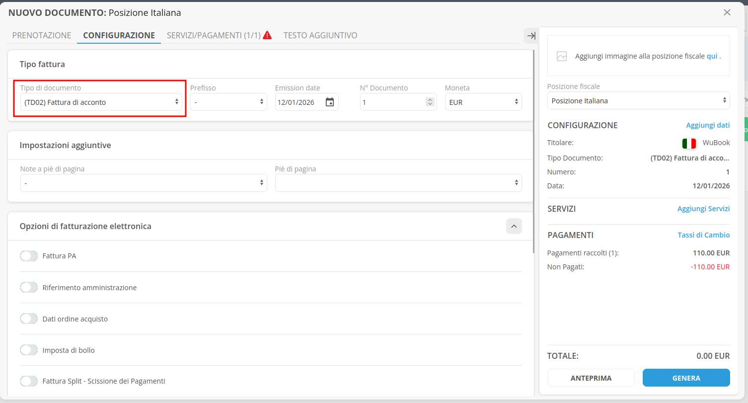 ZaK possiede una tipologia di documento specifica per la fattura d'acconto. Vediamo a seguire il funzionamento.