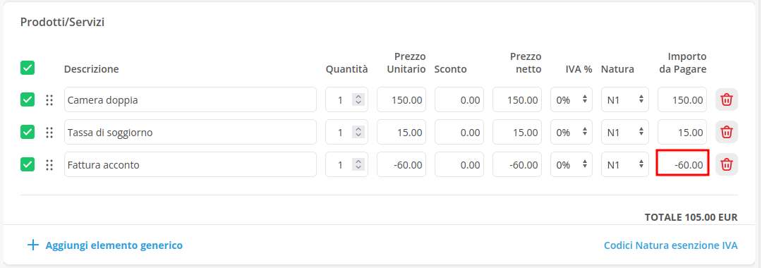 Puoi ora proseguire con l'emissione. ZaK segnalerà 60€ come già pagati e fatturati e 100€ ancora da saldare.
