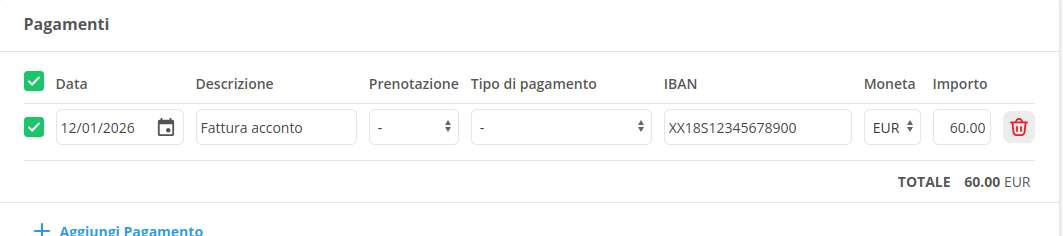 Nel momento in cui ricevi il saldo (100€) dal cliente, occorre registrare anche questi 100€ nella sezione "PAGAMENTI", così ora risulterà un pagamento di 160€ totali (100+60). Clicca ora sulla sezione "FATTURE" e procedi emettendo una normale fattura.