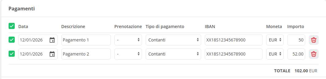 Sulla stessa prenotazione puoi inserire più pagamenti, il totale pagato e il restante non pagato verranno mostrati nel riepilogo in alto:
