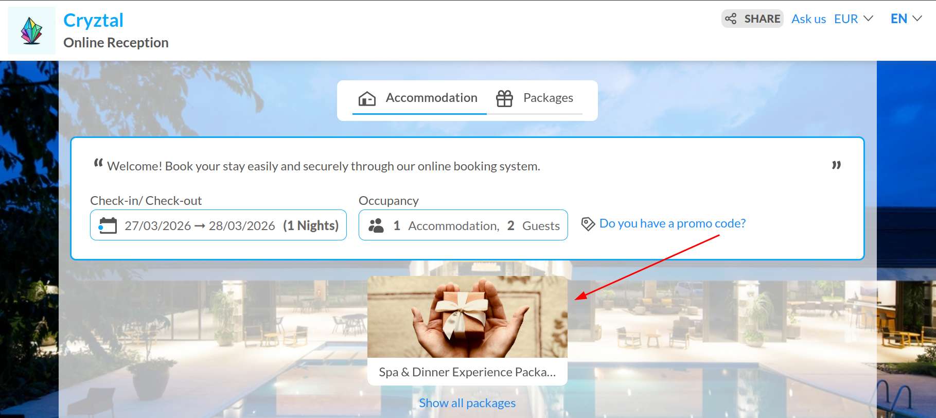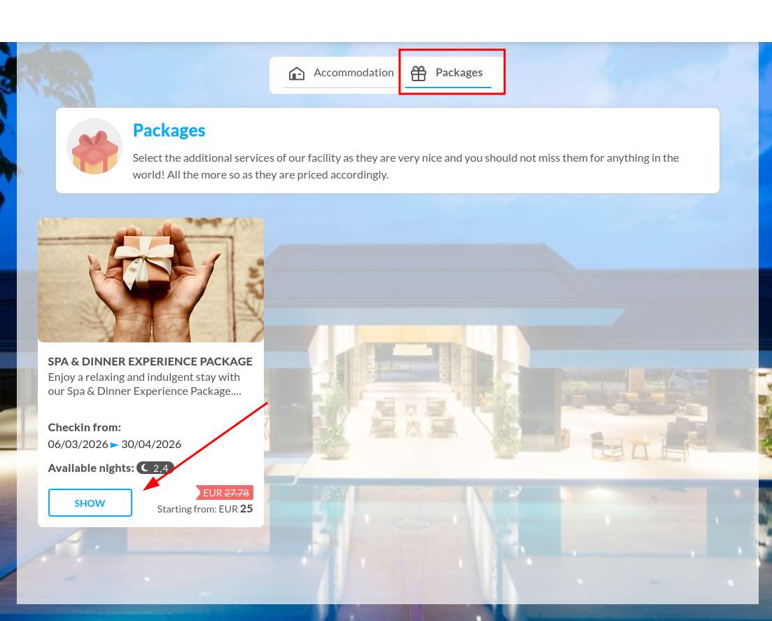 - Quando disponibile: Viene fatto un check su eventuali date di prenotazione e date di arrivo che hai impostato. Il pacchetto viene mostrato nel carosello solo se tali date vengono rispettate.