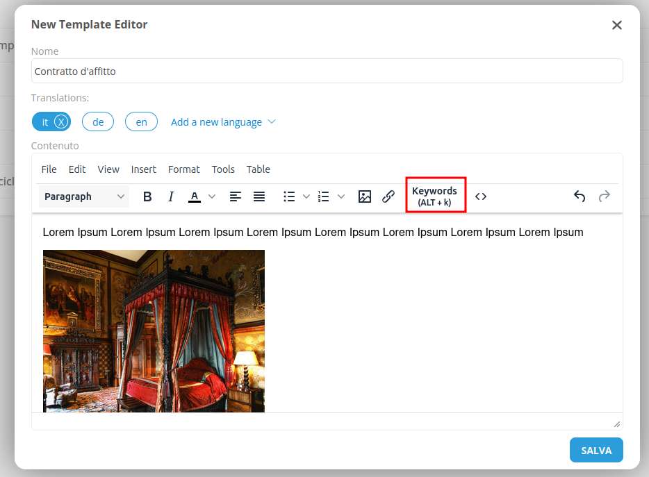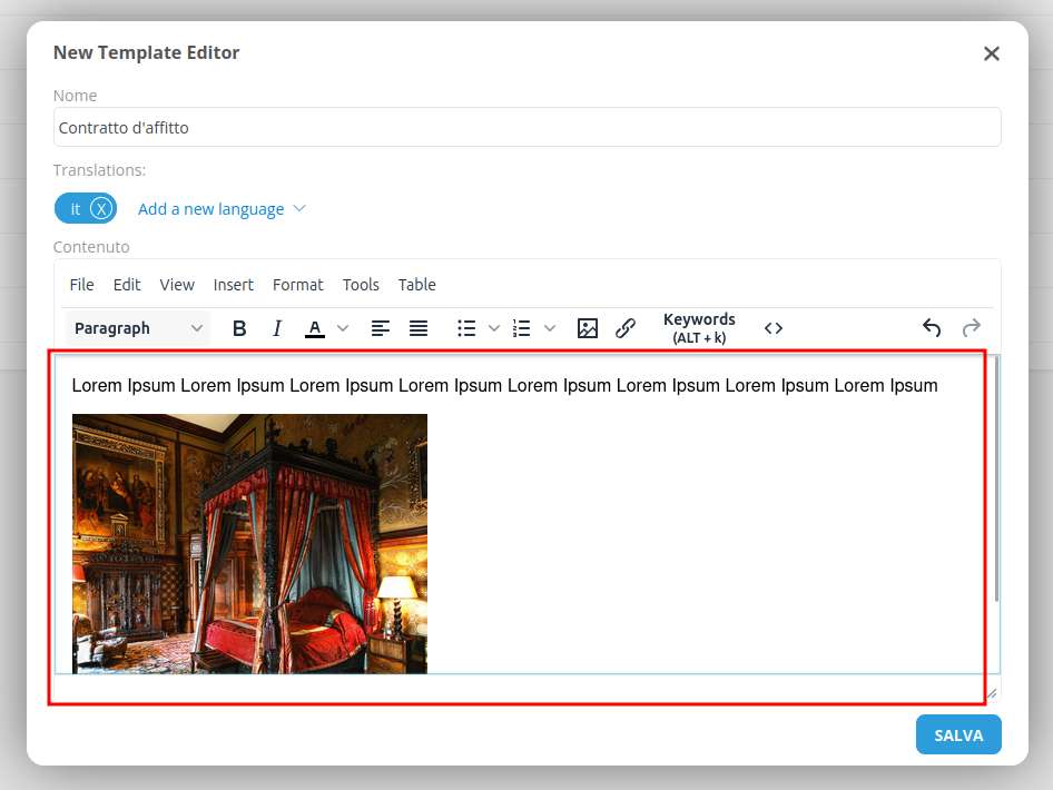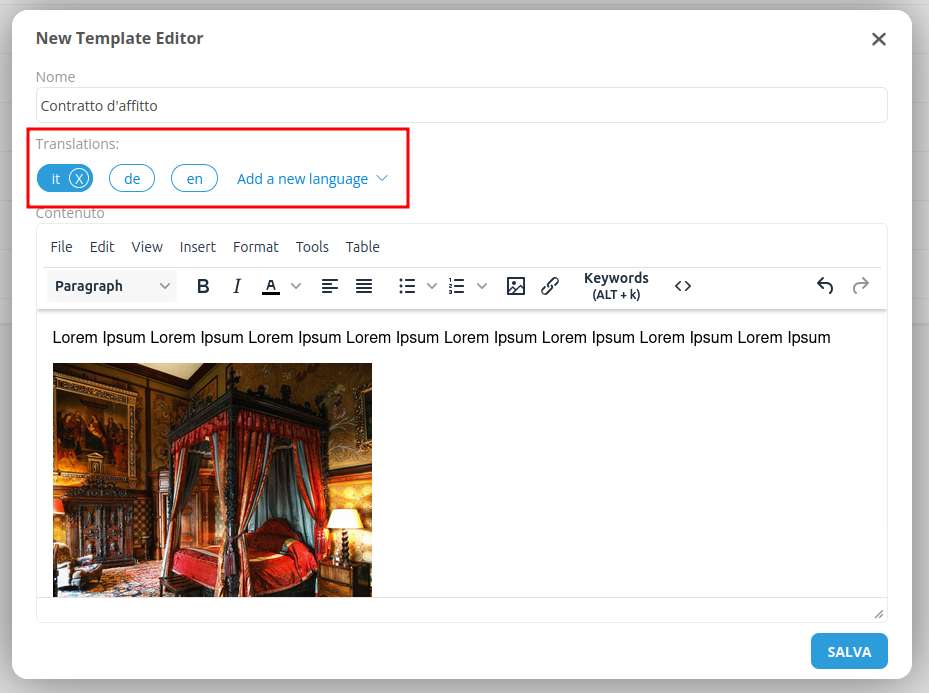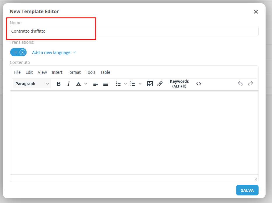 - Ripetere i passi 2 e 3 per ogni lingua in cui si vuole scrivere lo stesso contratto (ricordati di salvare con l'apposito tasto dopo ogni modifica);