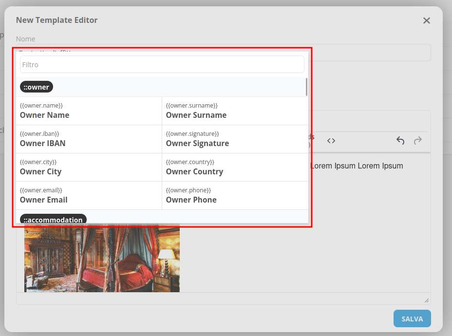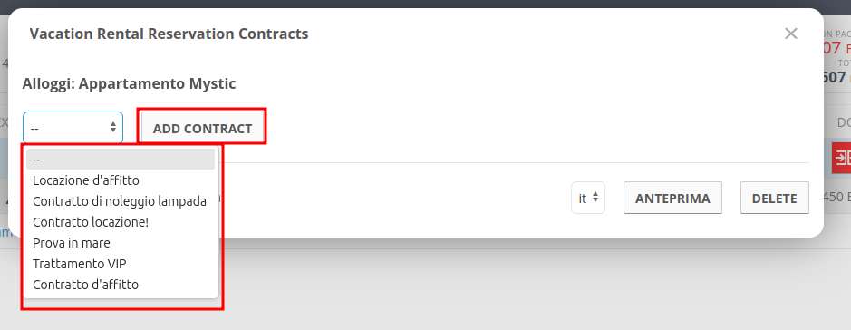 La sezione Contratti fornisce strumenti per redigere, archiviare e associare i contratti di locazione tra il gestore immobiliare e i proprietari degli alloggi. Il sistema utilizza un potente motore di modelli che supporta la personalizzazione, il riutilizzo e il collegamento a specifici alloggi o prenotazioni.