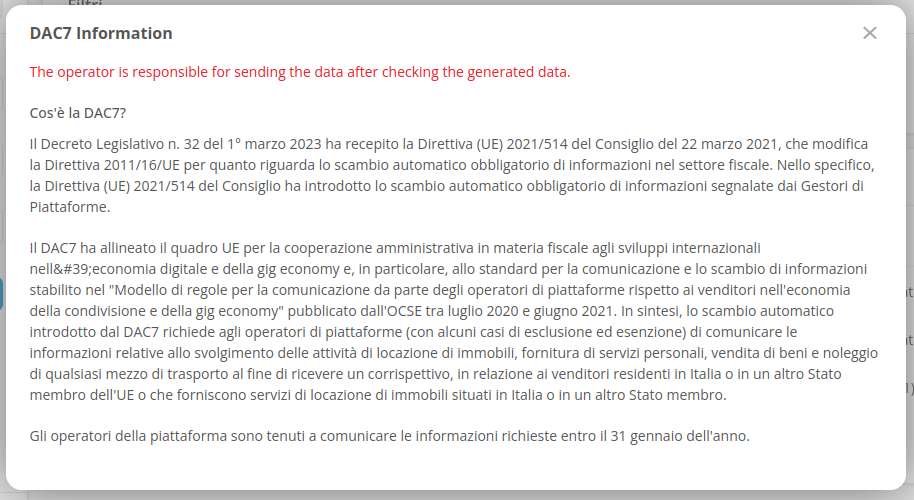 La sezione DAC 7 del Vacation Rental riguarda i requisiti legali stabiliti dall'Unione Europea per i gestori immobiliari che operano su piattaforme digitali. Questo modulo è responsabile della compilazione e revisione dei dati necessari alle autorità fiscali locali.