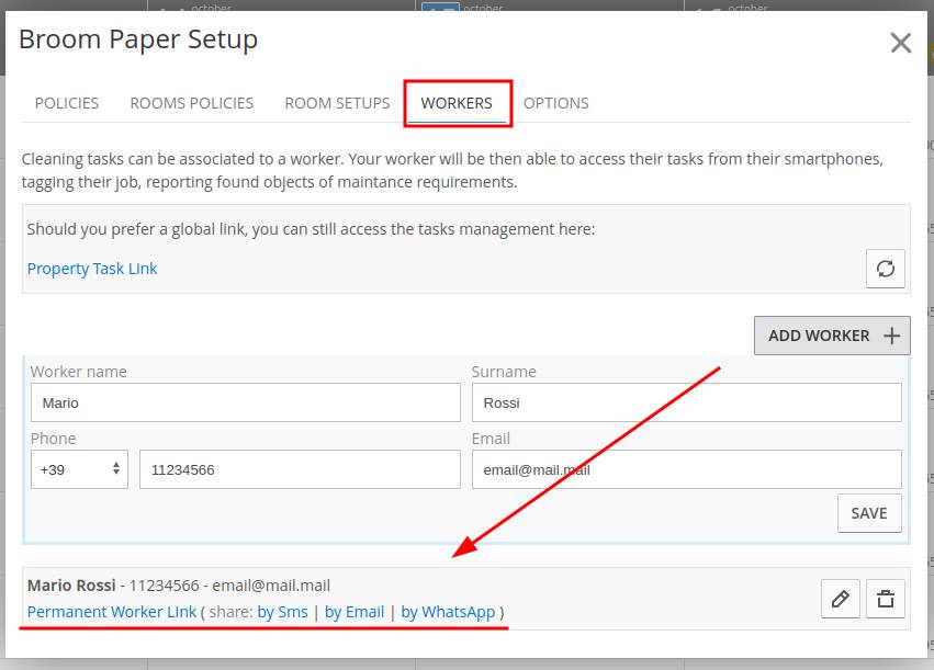 A partir desta seção você tem a possibilidade de acrescentar um ou mais colaboradores. Você pode então distribuir as tarefas de limpeza entre os diferentes trabalhadores e enviar a cada um deles um link com suas tarefas de limpeza. Para cada trabalhador, você também pode especificar seu e-mail e número de telefone, que você precisará enviar o link. Portanto, uma vez criado o trabalhador, você pode enviar-lhe o link via e-mail, SMS ou Whatsapp, clicando no botão apropriado (como indicado pela seta na imagem a seguir):