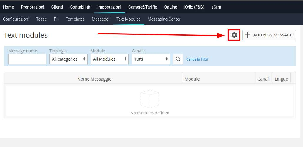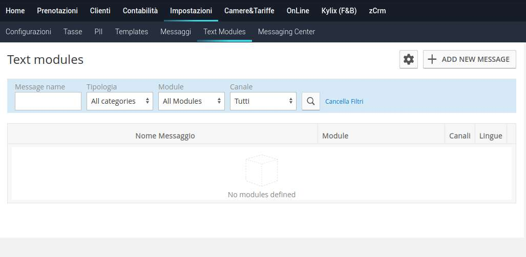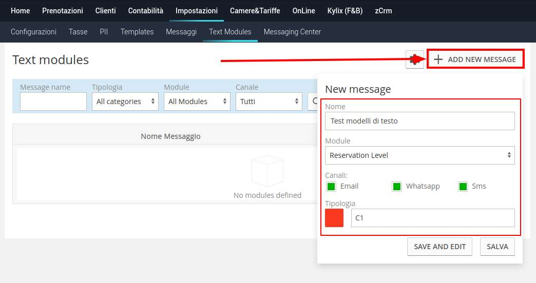 By clicking on the "Add New Message" button at the top of the page, you can create a new message, you can choose a name, one of the 5 available modules, the messaging channels on which you will be able to send the message (Email, WhatsApp, Sms), and the category of the message.