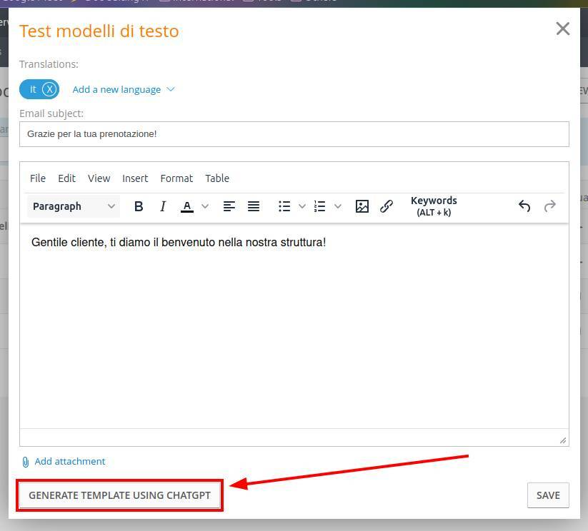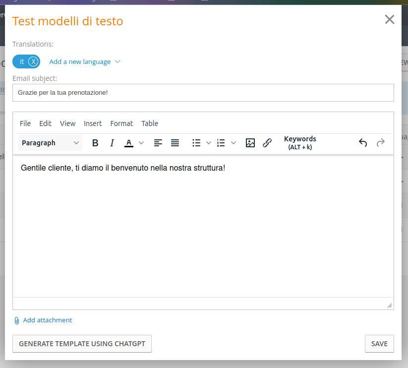 Very often, the text generated by ChatGPT will include keywords such as "[Hotel name]" or "[Customer name]", these are not compatible with ZaK's keywords, and should be replaced with the software's native keywords, shown below.