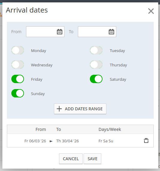 По умолчанию пакет всегда будет доступен для бронирования, независимо от даты, которую выбирает гость. Если же вы хотите, чтобы проживание было доступно для бронирования только на определенные даты, то вам придется указать их в этом разделе.
